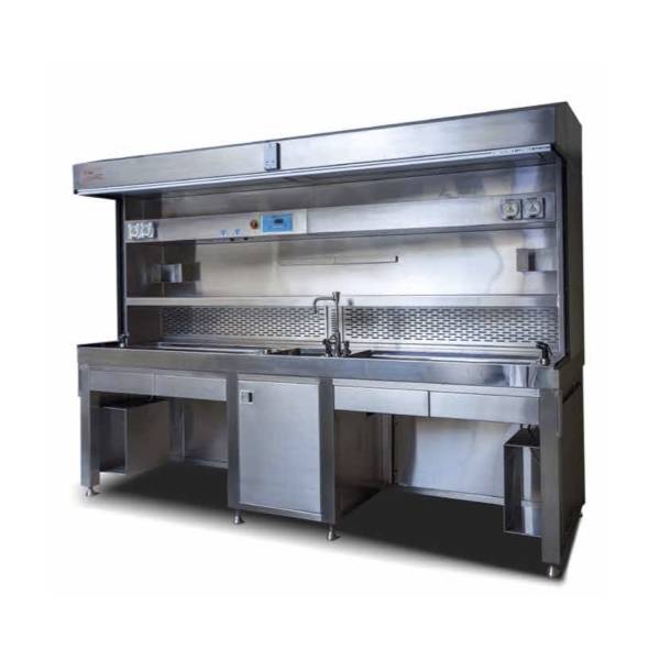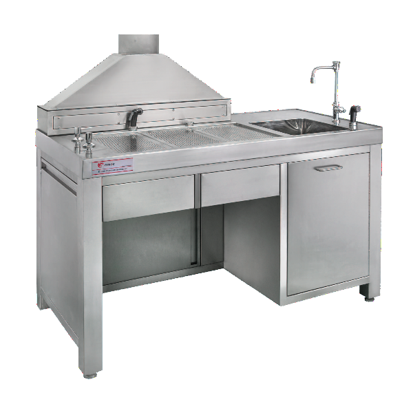 The Emec AOT260 is equipped with a downdraft ventilation system ensuring the operator is completely protected from harmful fumes & smells. The Emec Autopsy table can be completely customised to suite the use & requirement. Option include motorized height adjustment, connection to external exhaust, hot & cold water.