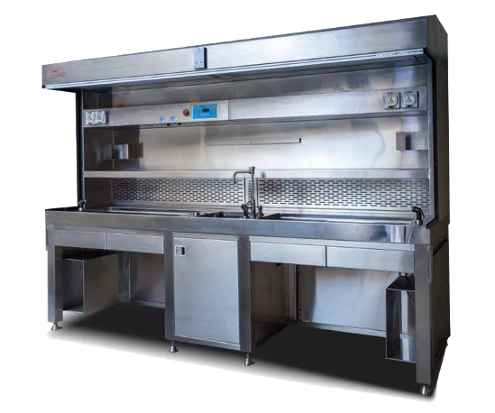 The T-Series workstation is equipped with a back & downdraft ventilation system ensuring the operator is completely protected from harmful formaldehyde fumes. The T-Series can be fitted with a re-circulating exhaust system with high efficiency pottasium permanganate filters or carbon filters which safely neutralize the harmful fume or can be fitted for external exhaust.